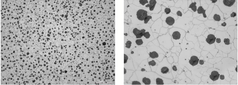 ดังนั้น จากการสังเกตเชิงประจักษ์ เมื่อสังเกตกราไฟท์ที่ลอยอยู่ในเหล็กหลอมเหลว (ที่อุณหภูมิประมาณ 1200°C) ถึงขีดจำกัดสูงสุดของค่าเทียบเท่าคาร์บอนในเหล็กดัด (ที่อุณหภูมิประมาณ 1200°C) ผลกระทบของปริมาณคาร์บอนต่อประสิทธิภาพของเหล็กดัด: ปริมาณคาร์บอนในการหล่อเหล็กดัดส่งผลต่อปริมาณกราไฟท์ที่ตกตะกอนในระหว่างการแข็งตัว ซึ่งหมายถึงขนาดเฉลี่ยหรือจำนวนทรงกลมกราไฟท์ โดยปกติแล้วปริมาณคาร์บอนของการหล่อเหล็กดัดอยู่ระหว่าง 2% ถึง 3.9% แต่สิ่งสำคัญคือต้องเข้าใจผลกระทบของการลดปริมาณคาร์บอนที่มีต่อคุณสมบัติทางกลของเหล็กหล่อ ควรพิจารณาโดยพิจารณาจากโครงสร้าง ขนาด ความหนาของผนัง และข้อผิดพลาดในความหนาของผนังของผนังระนาบที่อยู่ติดกันการหล่อเหล็กดัด- การลดปริมาณคาร์บอนในเหล็กดัดจากประมาณ 4% เหลือ 2.5% สามารถเพิ่มความต้านทานแรงดึงและความแข็งแรงของผลผลิตได้เล็กน้อย (ประมาณ 23 ถึง 31 N/mm²) และยังเพิ่มการยืดตัวได้ประมาณ 5% โดยมีการปรับปรุงค่าแรงกระแทกอย่างมีนัยสำคัญ
